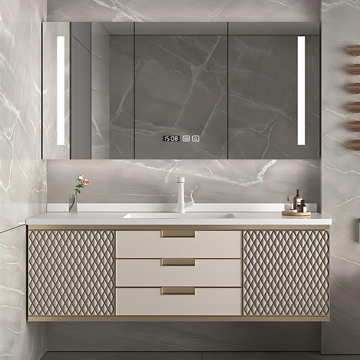 Create a sleek, modern space with a Wall-Mounted Vanity that floats above the floor for a clean, airy feel. Perfect for small bathrooms, it adds a touch of minimalism while offering practical storage and effortless style.