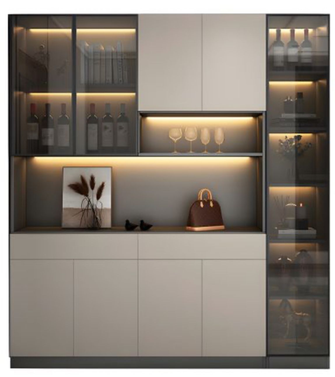 A home bar cabinet is a dedicated furniture unit for storing, organizing, and serving beverages. It may include racks for bottles and glasses, a countertop for mixing, and drawers for bar tools.