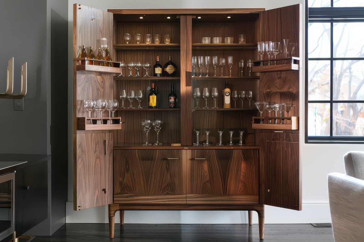 You can include wine racks, glass holders, lockable liquor storage, pull-out trays, LED lighting, mirrors, mini-fridge space, and even fold-down serving counters.