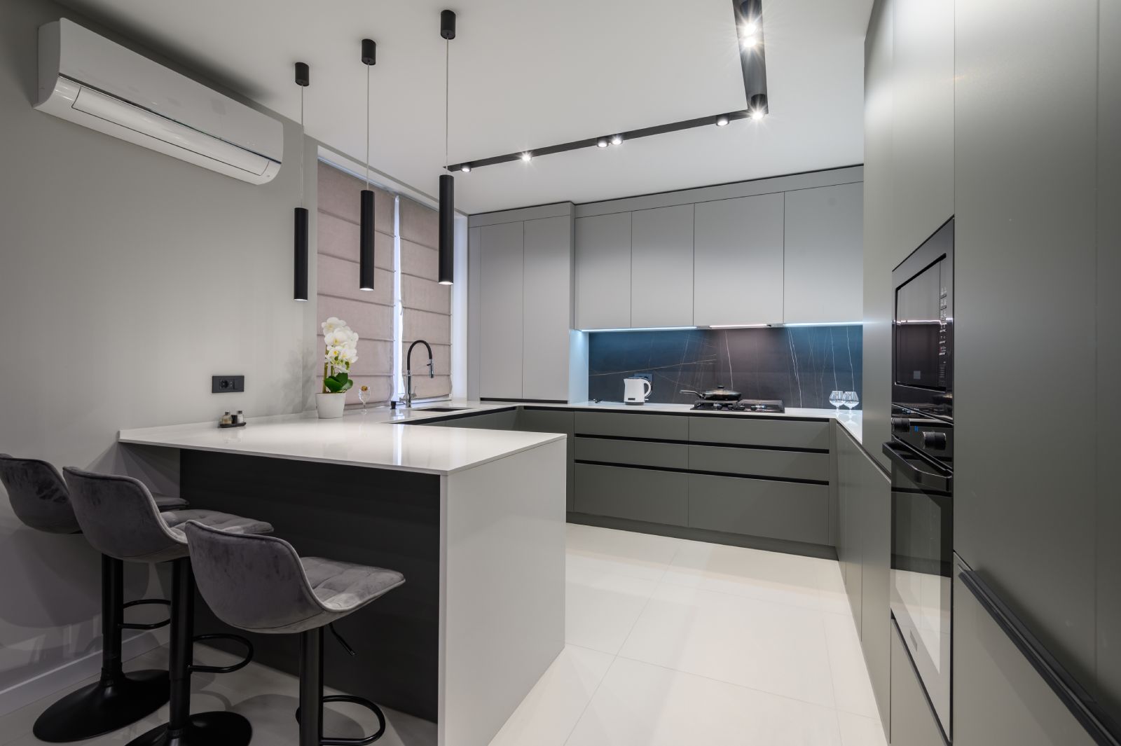 Take functionality a step further, The G-shaped modular kitchen builds on the U-layout with an added peninsula. It offers extended counter space and storage, making it great for and serious home chefs